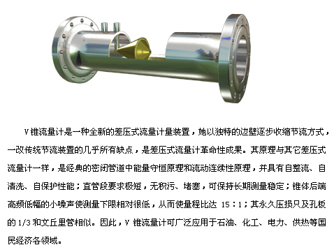 V錐流量計是一種全新的差壓式流量計量裝置,并以特的邊壁逐步收縮節(jié)流方式,一改傳統(tǒng)節(jié)流的幾乎所以缺點(diǎn),是差壓式流量計革命性成果,因此V錐流量計可廣泛用于石油,化工,電力,熱供等國民經(jīng)濟(jì)各L域
